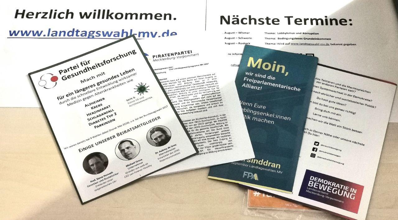 Mit dabei waren heute in Greifswald: Die Gesundheitspartei, die Freiparlamentarische Allianz, die Demokratie in Bewegung und die Piratenpartei. Wir danken der FPA für die gute Vorbereitung.